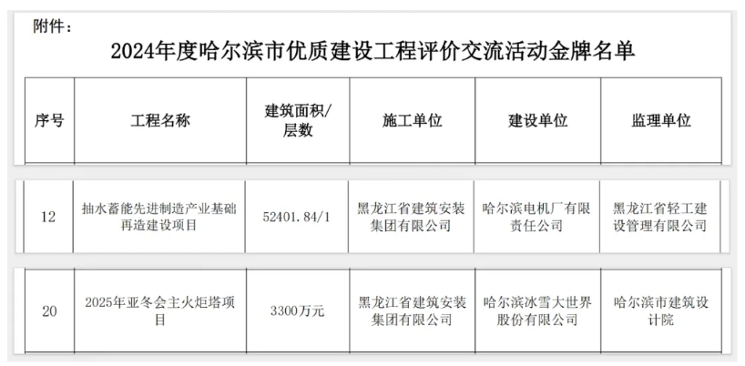 近日,哈尔滨市建筑业协会公布了2024年度哈尔滨市优质建设工程评价交流活动金牌、银牌评选结果,由龙江安装集团承建的哈尔滨电机厂抽水蓄能先进制造产业基础再造建设项目和2025年...